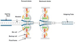 The two work rolls with the die groove, press forward and backward the shell against the mandrel to reduce to final dimension, cross section and tolerance.
