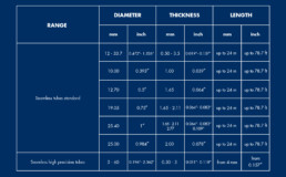 Diameters 12 -114.3 mm 0.472 - 4.50 inchThickness 0.50 - 4.00 mm 0.02 - 0.157 inchLength up to 30 m up to 100 ftU-bent tubes